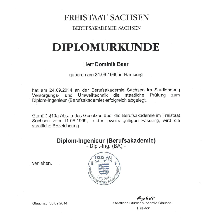 - Diplomurkunde Versorgungs- und Umwelttechnik (2014)